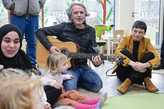Die Partizipation der Kinder ist ein wichtiger Bestandteil unserer pädagogischen Arbeit. Auch für unseren Musikpädagogen Björn Krüger steht dies im Fokus seiner Arbeit im Kulturkindergarten. Ein zentraler Teil seiner durch das „Lions-Hilfswerk Wuppertal – Bergisch Land“ finanzierte Arbeit ist das Komponieren und Texten neuer Lieder gemeinsam mit den „Farbenkindern“. Ihre Ideen und aktuellen Themen sind immer wieder Ausgangspunkt weiterer Songs, die dann kurz darauf im großen Morgenkreis in der „Piazza“ mit allen Kindern gemeinsam gesungen werden. Das aktuelle Lieblingslied im Haus ist „Ich mag die ganze Welt“, in dem aufgezählt wird, wofür die Herzen unserer Jüngsten schlagen: „Feuerwehrmann Sam“, „Meine Schwester Yasemin“, „Fahrrad fahren“ und die Erkenntnis: „Was ich am meisten mag bist Du!“