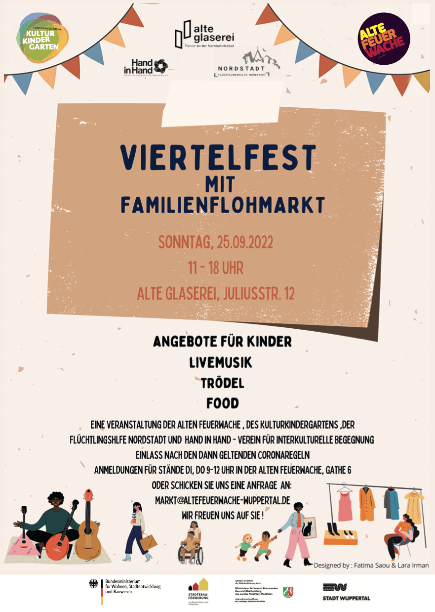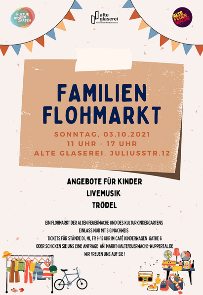 Am Sonntag, den 03. Oktober 2021 veranstaltet der Kulturkindergarten, die Alte Feuerwache und die Kulturwerksatt einen großen Flohmarkt mit Familienfest, Angeboten für Kinder und Live-Musik in der „Alten Glaserei“ in der Juliusstraße 12 (am Kindergarten vorbei, bis zum Ende der Straße und dann das letzte Haus auf der linken Seite). Zur Eröffnung am 03.10. freuen wir uns besonders auf den ersten öffentlichen Auftritt des Sinfonieorchesters Wuppertal gemeinsam mit unseren Farbenkindern aus dem Kulturkindergarten.